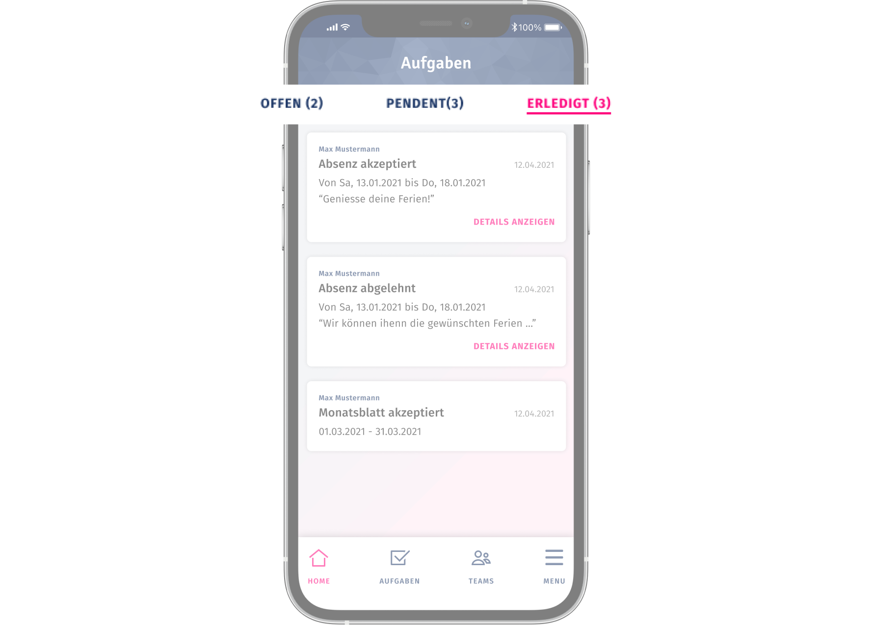 Sobald Sie die Aufgabe abgeschlossen haben, wird der Mitarbeitende informiert. Akzeptierte Absenzen werden zudem automatisch an Mirus HR 3.0 übertragen und sind im Dienstplan ersichtlich.