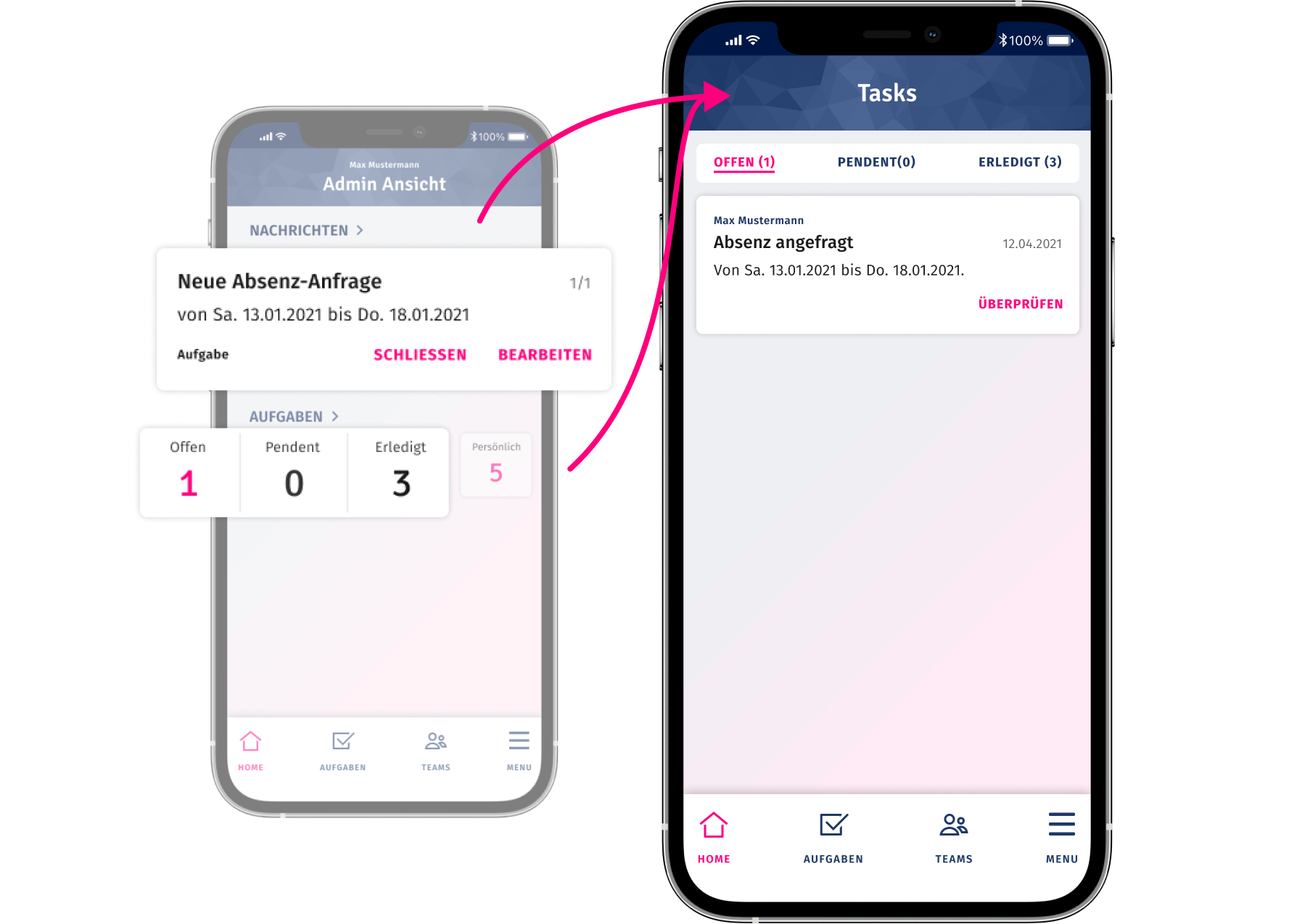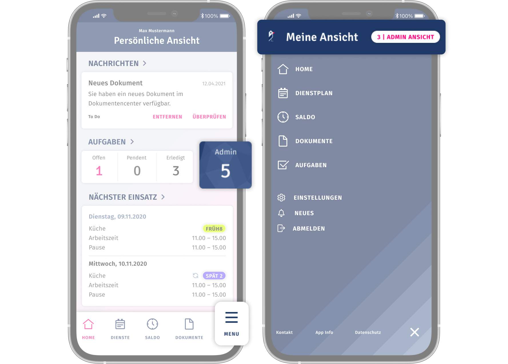 Als Vorgesetzte eines Teams steht Ihnen die Admin Ansicht zur Verfügung. In diesem Bereich der App finden Sie alle Aufgaben (z.B. Absenzen), die Ihr Team betreffen. Im Gegensatz zur persönlichen Ansicht, welche Ihre eigenen Dienstpläne, Dokumente und Aufgaben umfasst. Wechseln Sie einfach über das Menu zwischen den zwei Ansichten.