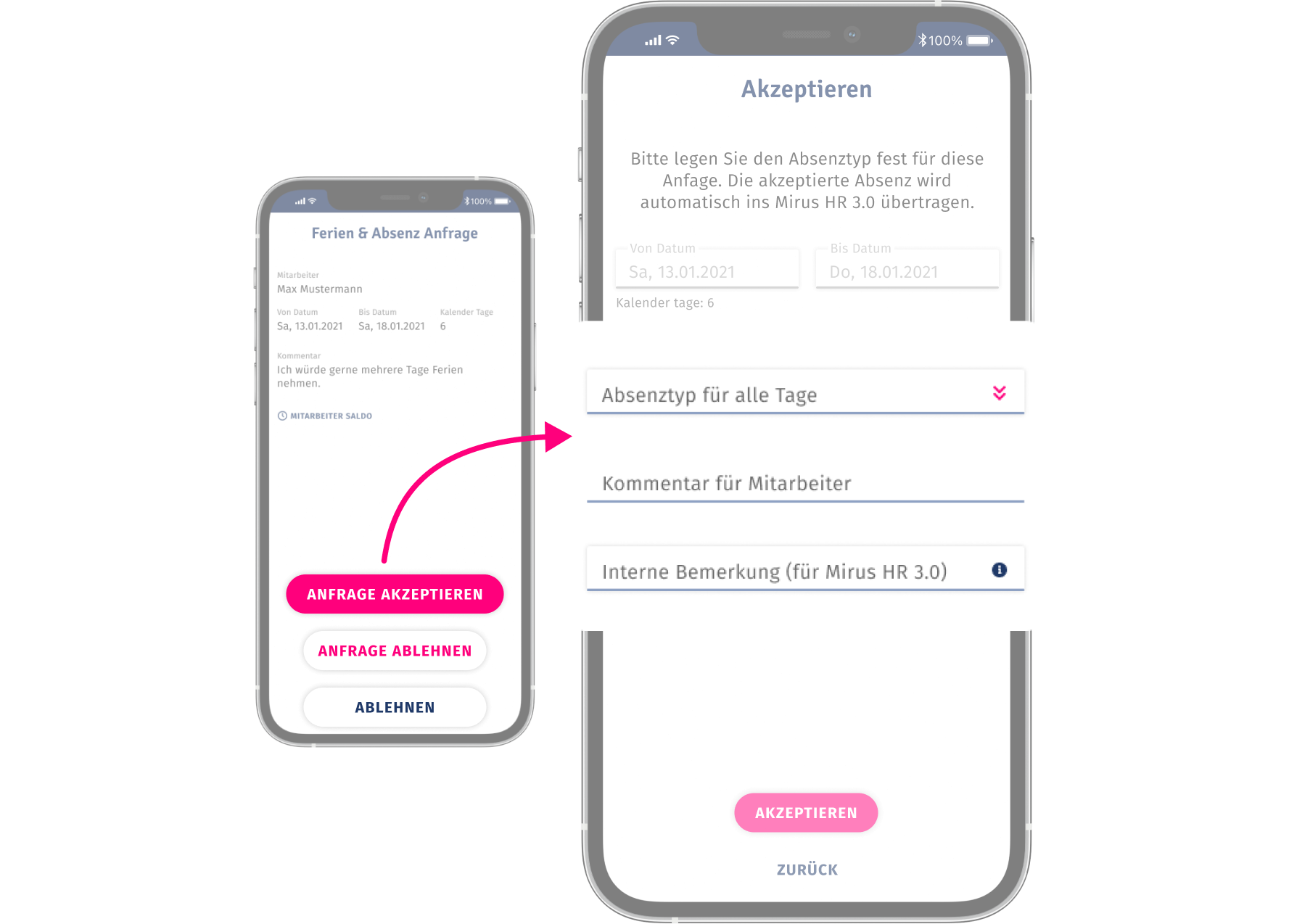 Mit dem Absenzen Management von Favur haben Vorgesetzte die Möglichkeit, Anfragen des Teams einfach über das Smartphone zu bearbeiten. In wenigen Sekunden können Sie Absenzanfragen akzeptieren oder ablehnen. Bewilligte Absenzen werden automatisch mit Mirus HR 3.0 synchronisiert.